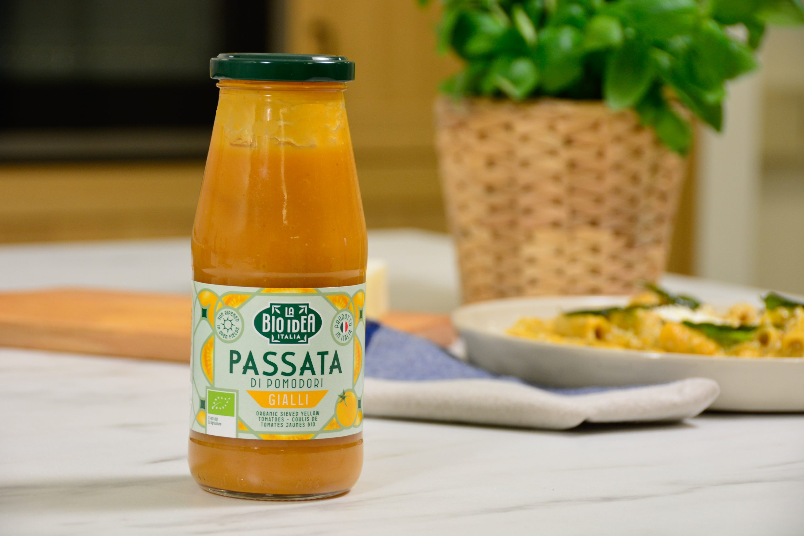 Doe de geroosterde paprika’s in een blender samen met de basilicum, 1 theelepel chilivlokken, een scheutje room, gele passata, de uitgeknepen geroosterde knoflooktenen, een handje geraspte pecorino, het bouillonblokje en zout en peper naar smaak. Mix tot een gladde, romige saus.